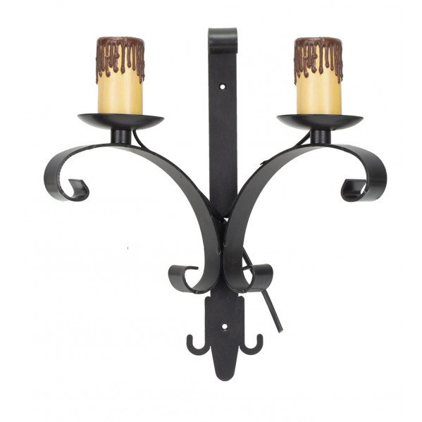 Aplique rústico de dos luces de la serie RUEDA en color MARRON RUSTICO. Realizado en metal con portavelas de policarbonato. Utiliza dos portalámparas E27, que vienen con sus portavelas imitando a la cera de quita y pon. Bombillas no incluidas. Se recomienda bombillas Led en forma de vela para potenciar el diseño del aplique y conseguir un mayor ahorro en el consumo. El estilo rústico es ideal para casas de campo, bodegones y restaurantes. Tiene unas medidas de 35x32x18 centímetros. Puede completar la serie con las lámparas de tres, cinco, seis luces y el aplique de una luz.