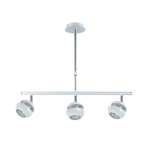 Colgante con tres focos de la serie BEETHOVEN de color BLANCO/PLATA. Realizada en metal con tres portalámparas GU10 . Bombillas no incluidas. De diseño moderno y original, combinando el blanco con la terminación en pan de plata, con focos redondeados y articulables verticalmente, con un giro horizontal de casi 360º permitiendo así dirigir los puntos de luz hacia cualquier zona de la estancia. Sus dimensiones son regulables en altura de 44<,68X56,5X12 centímetros. Modelo también disponible en color negro/oro. Se puede completar la colección con la versión de colgante cuatro luces, regleta de cuatro luces, regleta de tres luces, regleta de dos luces, plafón de tres luces y foco de una luz.