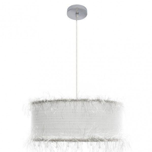 Colgante de la serie HILOS de color BLANCO. Este moderno colgante se caracteriza por una decoración de pasamanería de color blanco. Pantalla y armazón componen un conjunto perfecto para ambientar espacios con cierto toque vintage. Posee un portalámparas E27, bombilla no incluida, y su diámetro es de 50 centímetros. Se puede completar la serie con el colgante de 40 cm y el sobremesa a juego, disponibles en color beis, blanco y negro. Tiene unas dimensiones, regulables en altura, de 40<,100x50x50 centímetros.