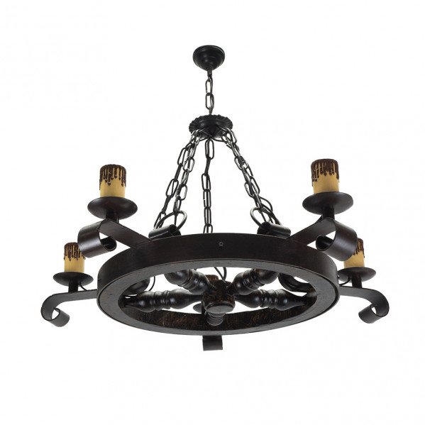 Lámpara rústica de cinco luces de la serie RUEDA en color MARRON RUSTICO. Realizado en metal y rueda de resina, con portavelas de policarbonato. Utiliza cinco portalámparas E27, que vienen con sus portavelas imitando a la cera, de quita y pon. Bombillas no incluidas. Se recomienda bombillas Led en forma de vela para preservar la esencia de la lámpara y conseguir un mayor ahorro en el consumo. El estilo rústico es ideal para casas de campo, bodegones y restaurantes. Tiene unas medidas, regulables en altura, de 40<,65x68x68 centímetros. Puede completar la serie con las lámparas de tres y seis luces y los apliques de una y dos luces.